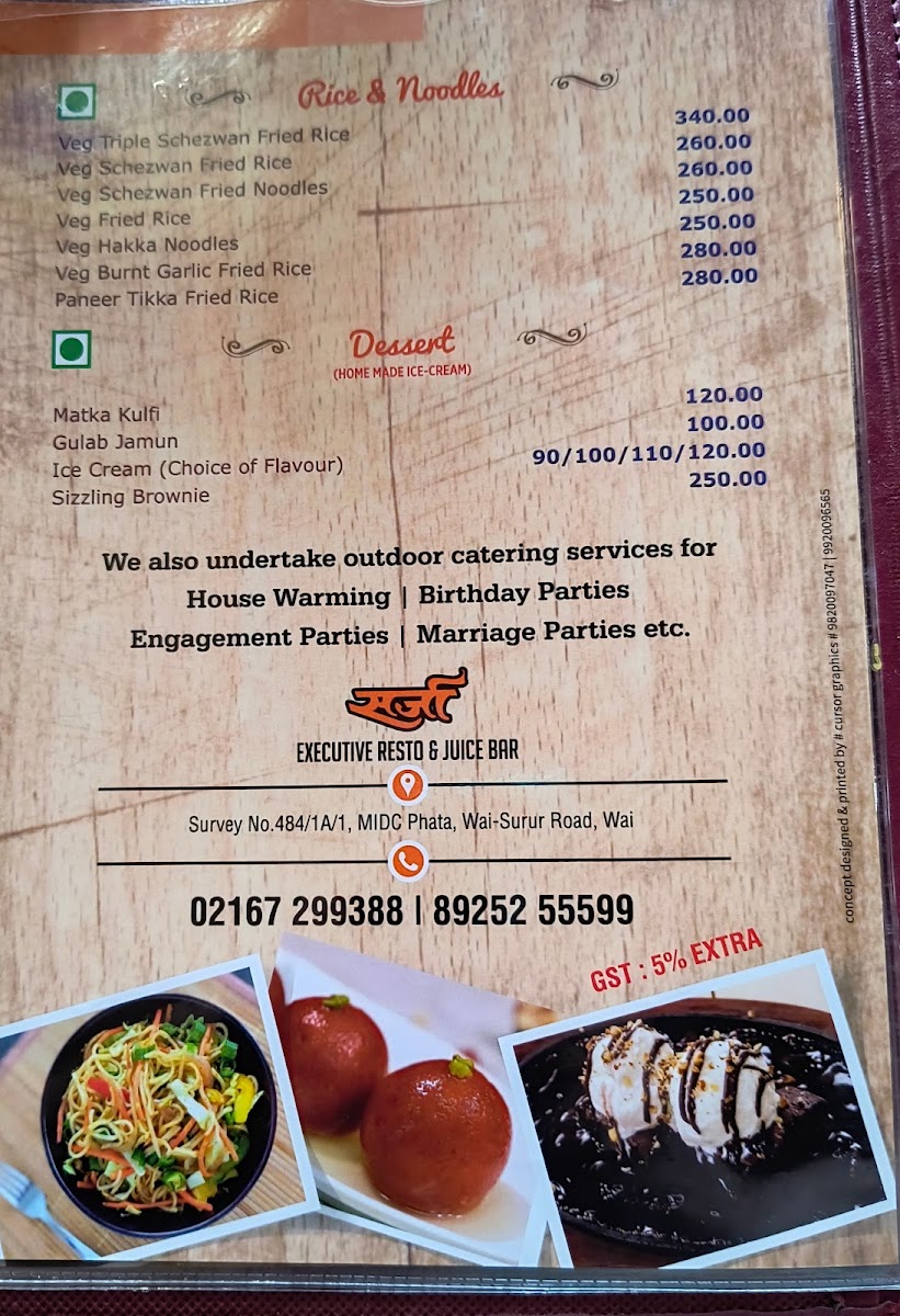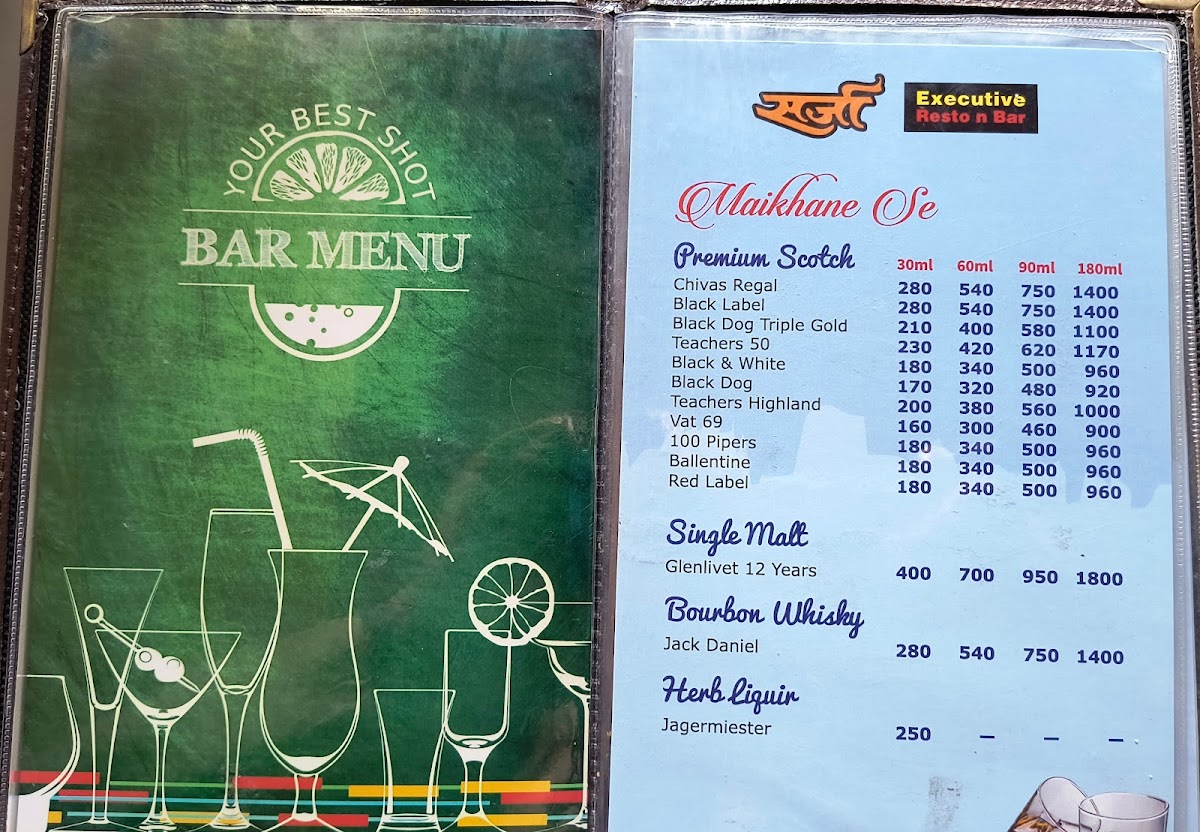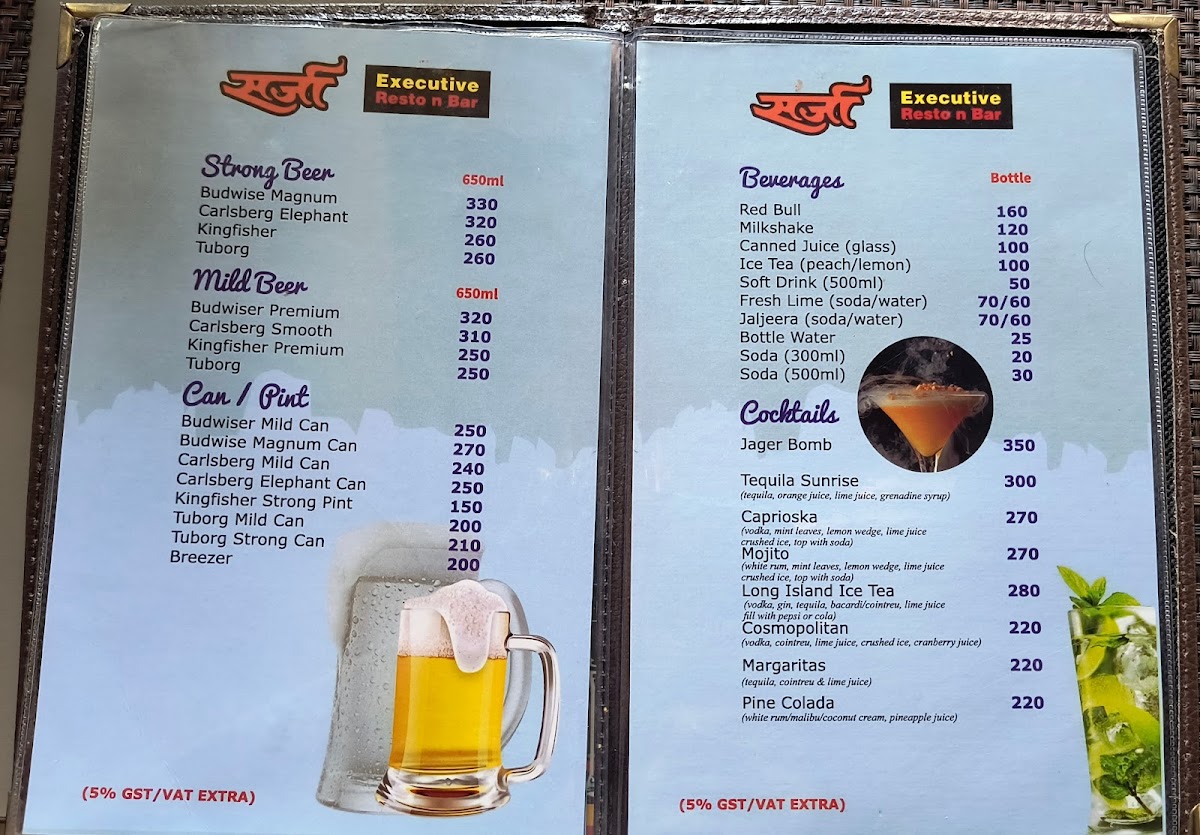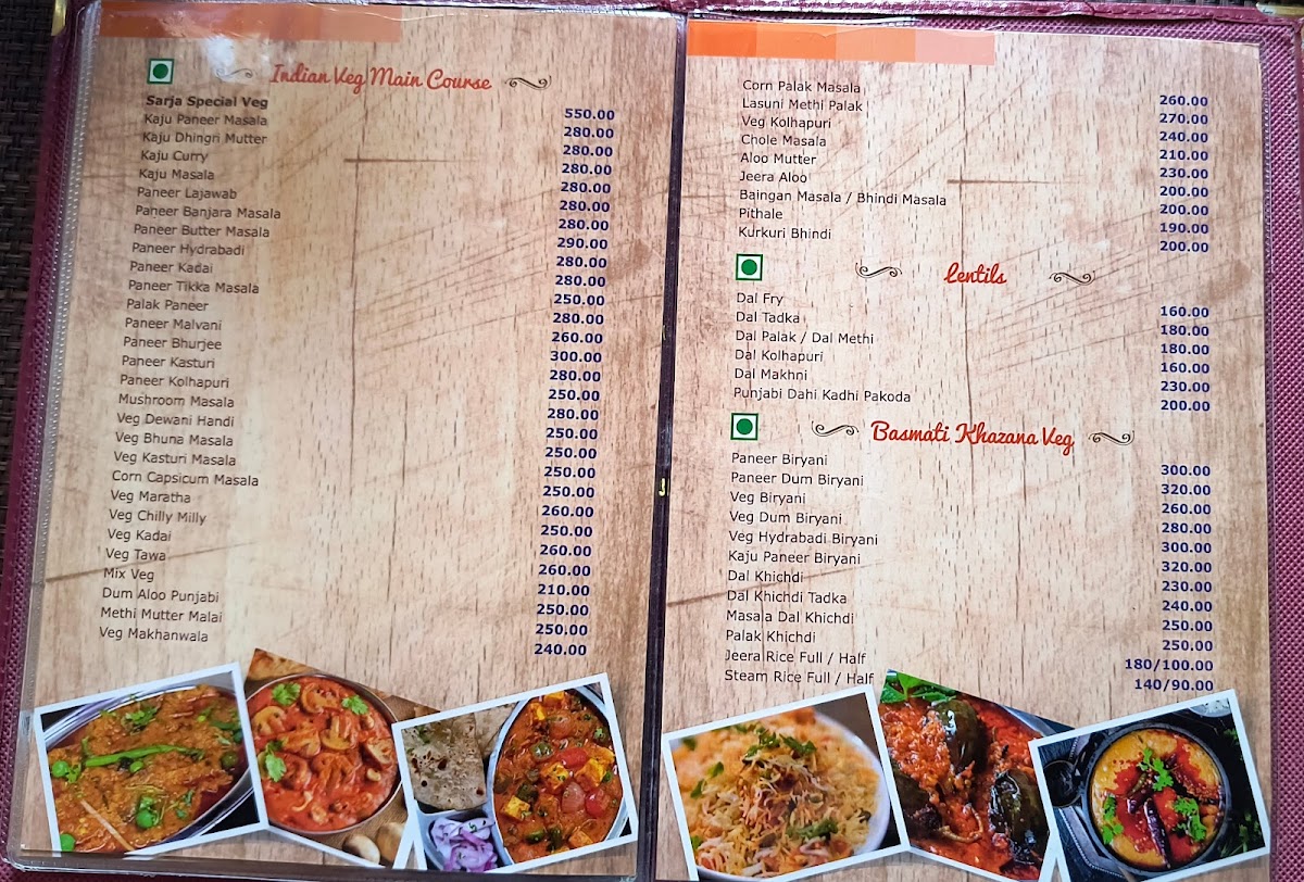 The Hotel Sarja Executive Restaurant & Bar Menu offers a delightful selection of dishes that cater to all tastes and preferences. Located on Wai-Surur Rd, in the heart of Shahbaug, Yashwant Nagar, Wai, the restaurant brings a unique blend of local and international flavors. Whether you're stopping by for a quick bite or enjoying a leisurely meal, the menu has something for everyone. From savory starters to hearty mains, each dish is crafted with care and packed with flavor. The bar menu complements the food perfectly, featuring refreshing beverages to pair with any meal. It's the perfect spot to unwind, enjoy a satisfying meal, and indulge in a memorable dining experience with family and friends.