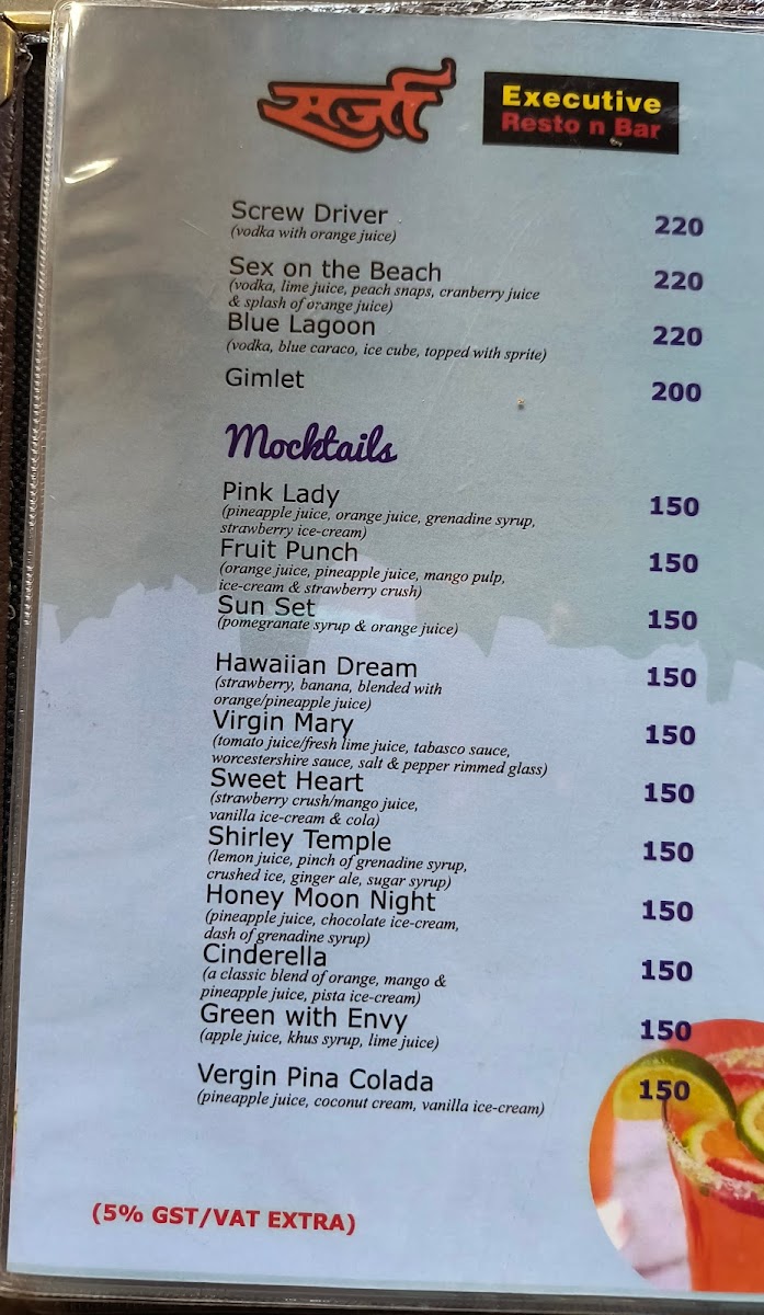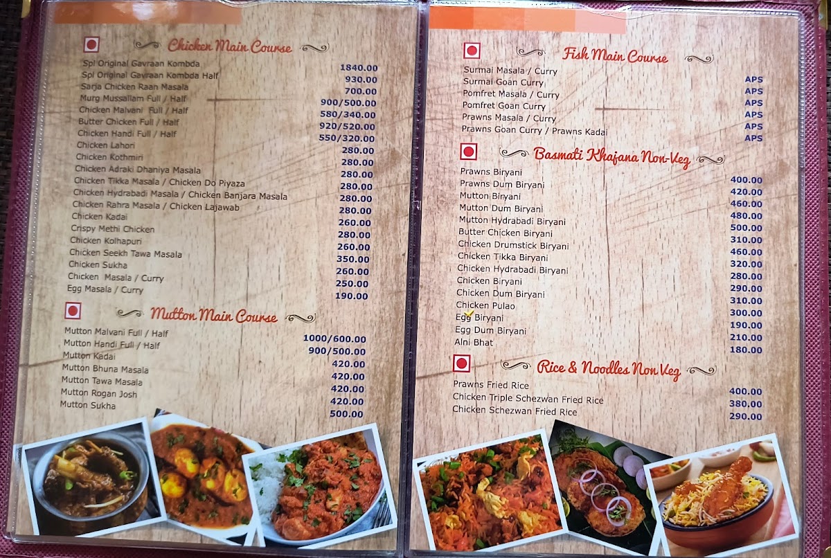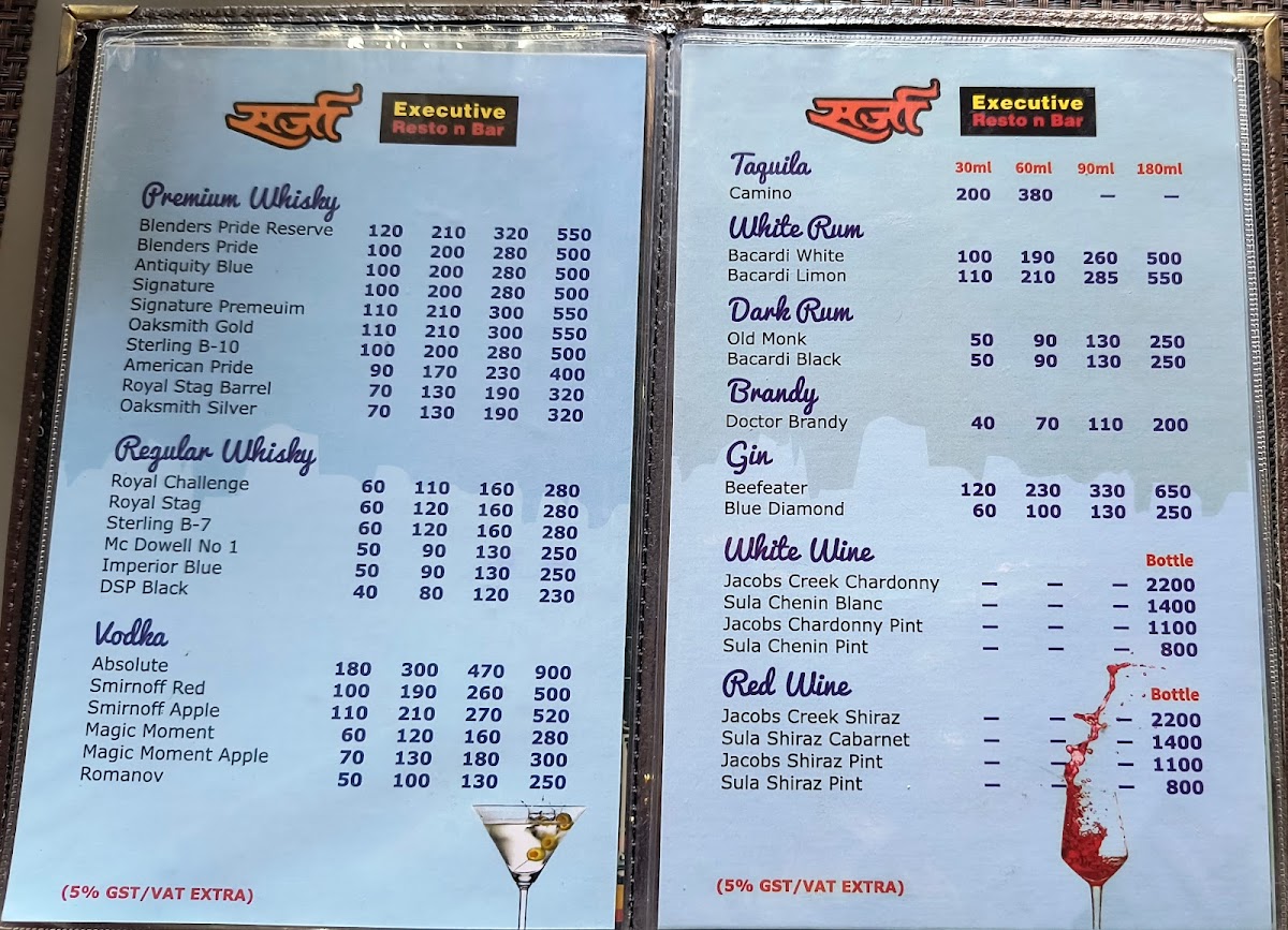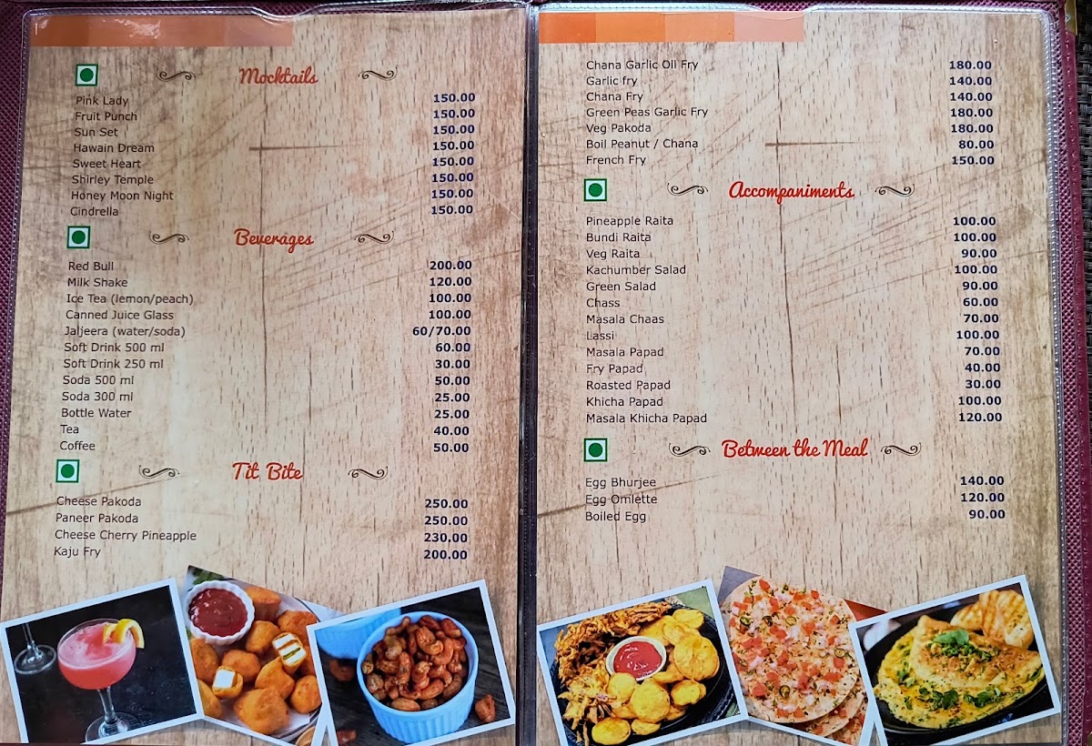 The Hotel Sarja Executive Restaurant & Bar Menu offers a delightful selection of dishes that cater to all tastes and preferences. Located on Wai-Surur Rd, in the heart of Shahbaug, Yashwant Nagar, Wai, the restaurant brings a unique blend of local and international flavors. Whether you're stopping by for a quick bite or enjoying a leisurely meal, the menu has something for everyone. From savory starters to hearty mains, each dish is crafted with care and packed with flavor. The bar menu complements the food perfectly, featuring refreshing beverages to pair with any meal. It's the perfect spot to unwind, enjoy a satisfying meal, and indulge in a memorable dining experience with family and friends.